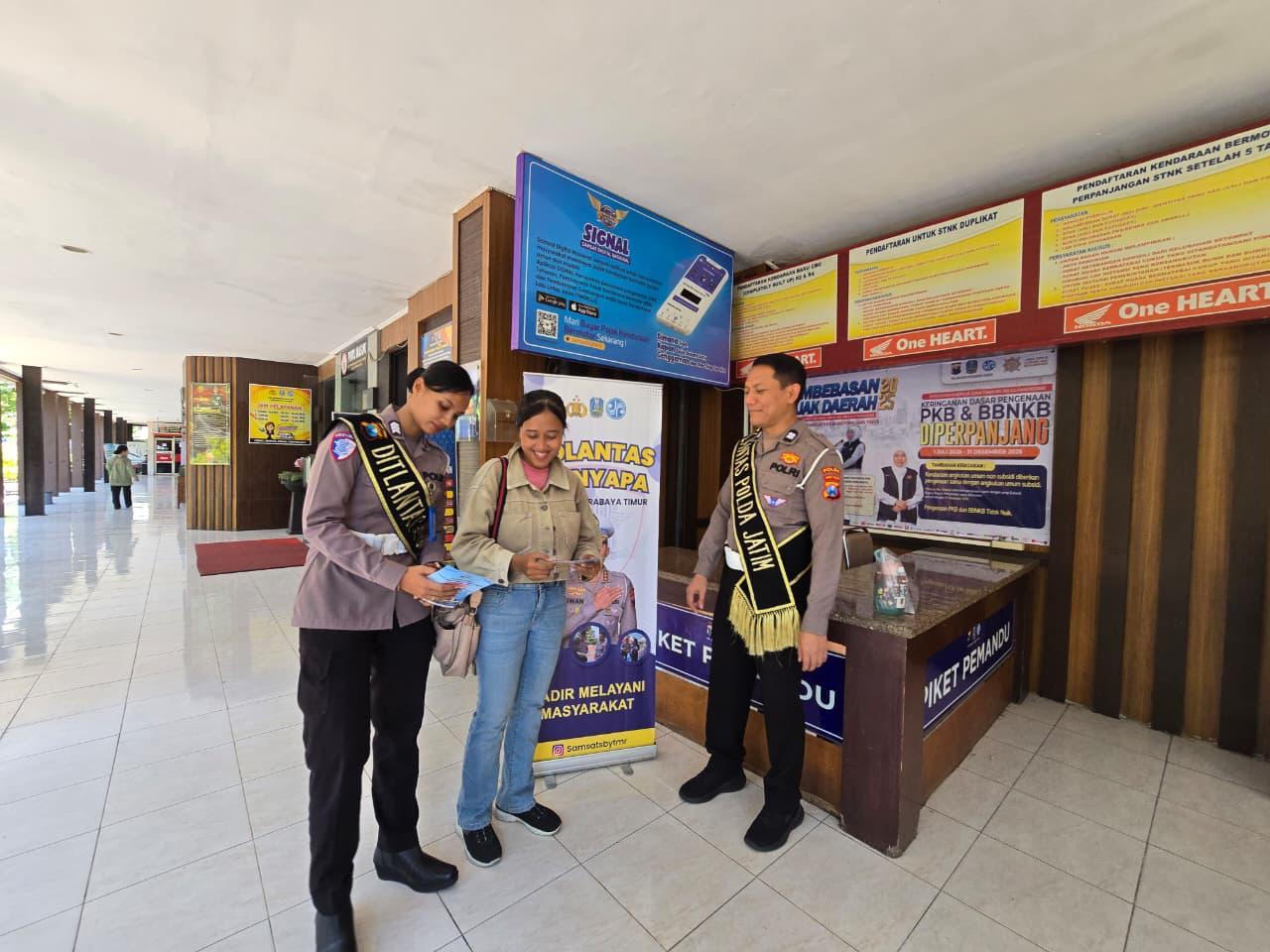 Melalui program ini, petugas pelayanan di jajaran Ditlantas Polda Jatim aktif memberikan edukasi, sosialisasi, serta informasi terkini seputar tata cara pengurusan administrasi kendaraan bermotor.